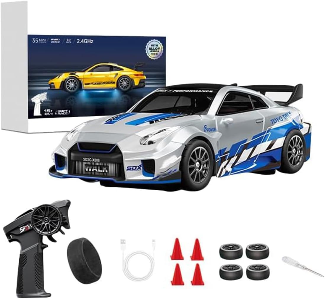 Specifications: Color: Dark Blue/Green/Purple/Dark Green/Magenta/Blue/Gary/Yellow/Red/White Material: Alloy, ABS, Nylon Speed (km/h): 20 Battery (mAh): 3.7V 300mAH (built-in) Remote Control Batteries: 2 x AA (not included) Charging: USB charging cable Remote Control Time (minutes): 25-35 Charging Time (minutes): 50-60 Remote Control Distance (meters): >35 Weight per unit (including batteries): 0.1g Packaging Weight (including gift box): 0.45kg Dimensions (cm): 11.7*5*3.5cm Packaging Dimensions (cm): 22.3*8.1*17.6cmPackage Including.Remote control * 1.Remote control handle * 1.Charging cable * 1.Roadblocks * 4.Spare tires * 4.Screwdriver * 1