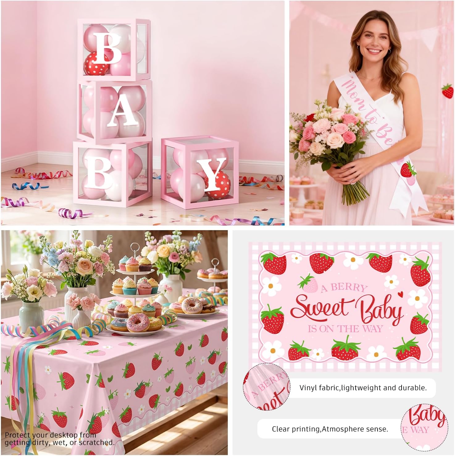 | Included Components | a set of 16-inch 'oh baby' letter foil balloons, 1pc a berry sweet baby is on the way backdrop(59x39.3in), 1 cake topper, 24 cupcake toppers, 1 corsage, 1 sash, 4 balloon boxes, 1 cupcake stand, 25pcs 9-inch a berry sweet baby is on the way plates, 25pcs 7-inch plates, 25 forks, 25 straws, 25 napkins and cups, 2 tablecloth(70.9x42.5in), strawberry balloon arch kit(105pcs baloons) |