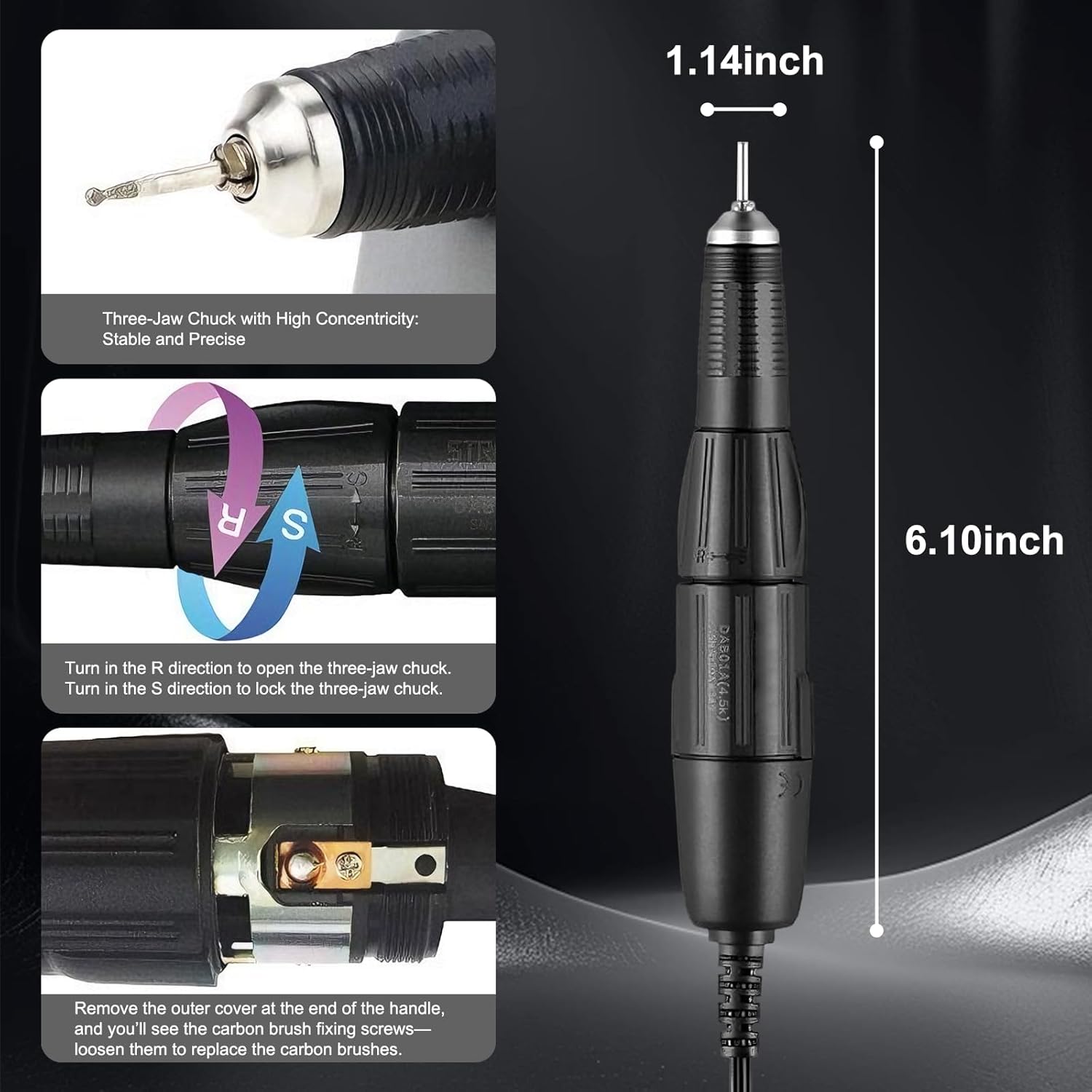 Product Specifications: Item Type:Nail Drills Machine Pen Material:Stainless Steel&Plastic Manicure P-olishing Tool Suitable for 90/204/210 strong model. Model: 102L Speed: 0~45000 P.P.M Chuck diameter: 2.35mm (standard) Handle weight: 0.27kg Torque: 290gf.cm