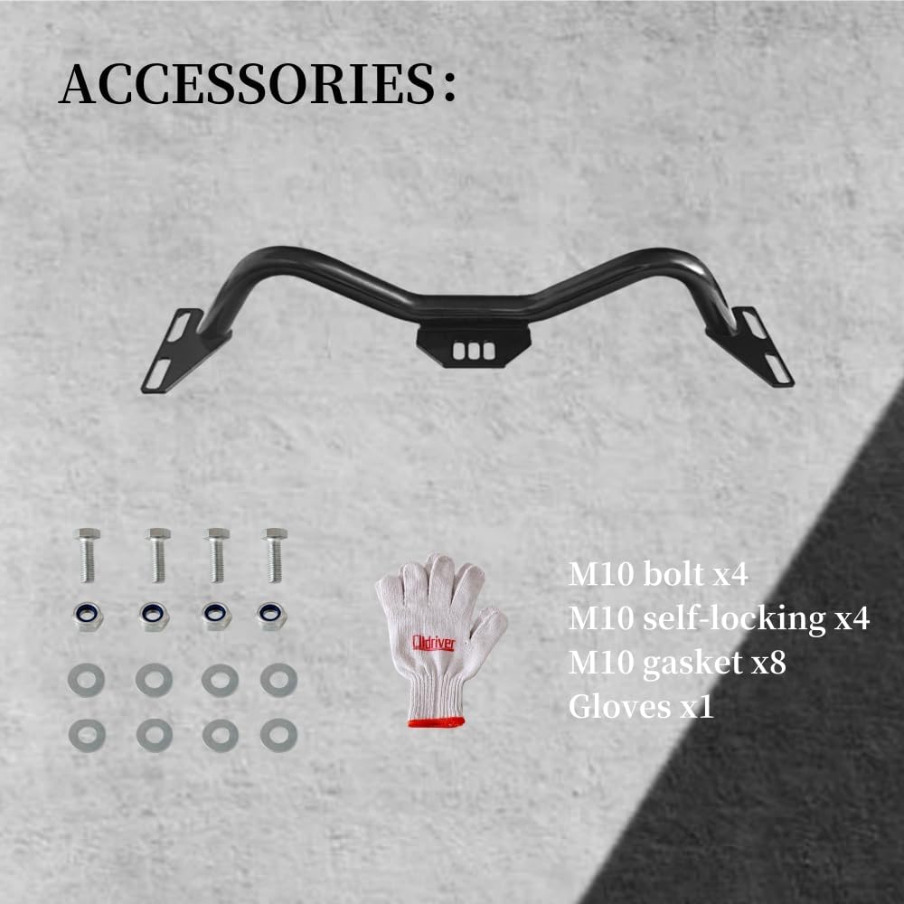 Included Components 4xM10 bolts, 4xM10 self-locking nuts, 8xM10 spacers, Gloves, Transmission Crossmember