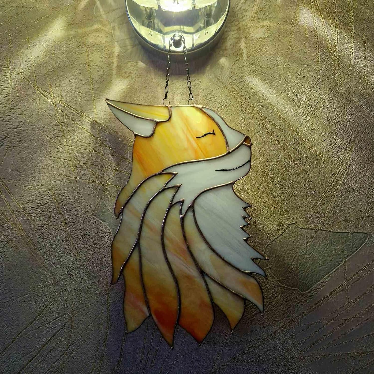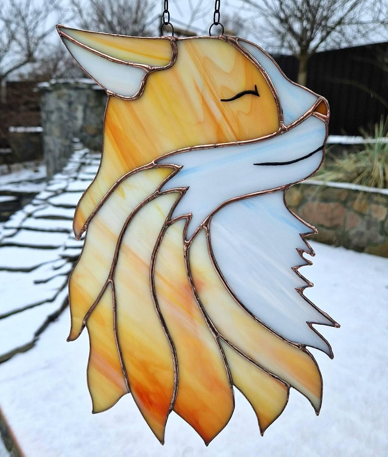 Add a touch of cat magic to any room with this stunning handmade stained glass suncatcher. Measuring 30 cm in height and 20 cm in width (approx. 12" x 8"), this suncatcher features a beautiful cat design. The hues of orange structured glass with a copper finish and application of images with gel varnishes convey the beauty of a real red cat. This cat looks equally good from both sides.The stained glass is crafted using Tiffany's technique and features all-over pattern, making it a true work of art. This suncatcher is ready to hang and will be a lovely addition to any room. Its production style is stained glass, solder, copper foil, patina, wire, and gel varnishes. The item is handmade in Ukraine and is an original piece. It is perfect for animal lovers and those who appreciate unique and beautiful decor.