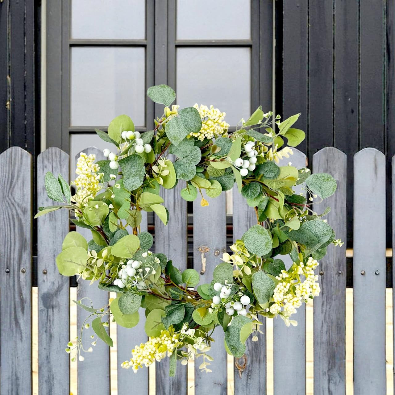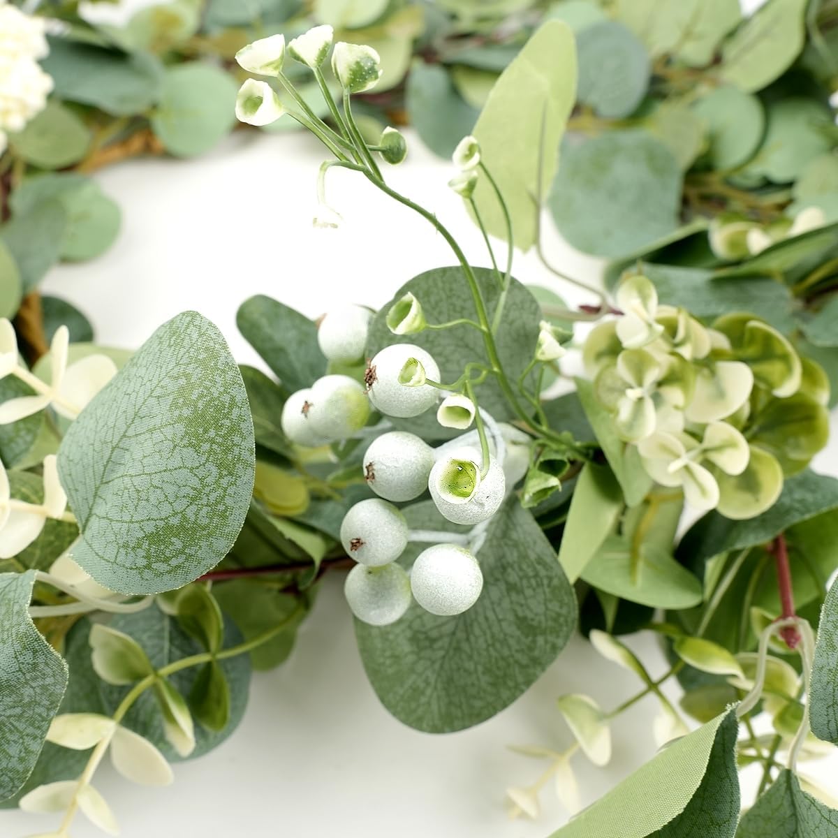 Why choose Avoik greenery wreaths? The faux wreath plants look very realistic, comparable to real plants in terms of color and shape, and will not fade and the plastic base is stronger and less prone to deformation and breakage; No need to water, always keep bright green. You can put it on the tabletop to decorate the center island, as a candlestick decoration or use it to decorate walls, corridors, stairs and so on. Reuse is one of the advantages of simulated wreaths; reduce the impact of plant turnover due to seasonal changes, saving you money. Please note Due to the long distance transportation problem, the leaves may be squeezed, please hang it for a few hours after you receive it and wait for the simulated greenery to fully unfold. Or use steam to vaporize. Use occasion: Holiday decoration: Halloween, Christmas, Autumn Harvest Festival, Mother's Day, Father's Day, Valentine's Day, Spring Festival, etc; Wall decoration: living room, bedroom, bar, hallway, front door, apartment, bathroom and other home decorations; Tabletop decorations: banquets, family gatherings, romantic dates, dinners, candle decorations, etc;. Specification Product Name: Artificial eucalyptus leaves wreath; Wreath Size: The diameter 42cm/16.5inches; Material: Silk leaves, Plastic; Decorative Occasions: Home porch farmhouse door wall window party decoration indoor outdoor