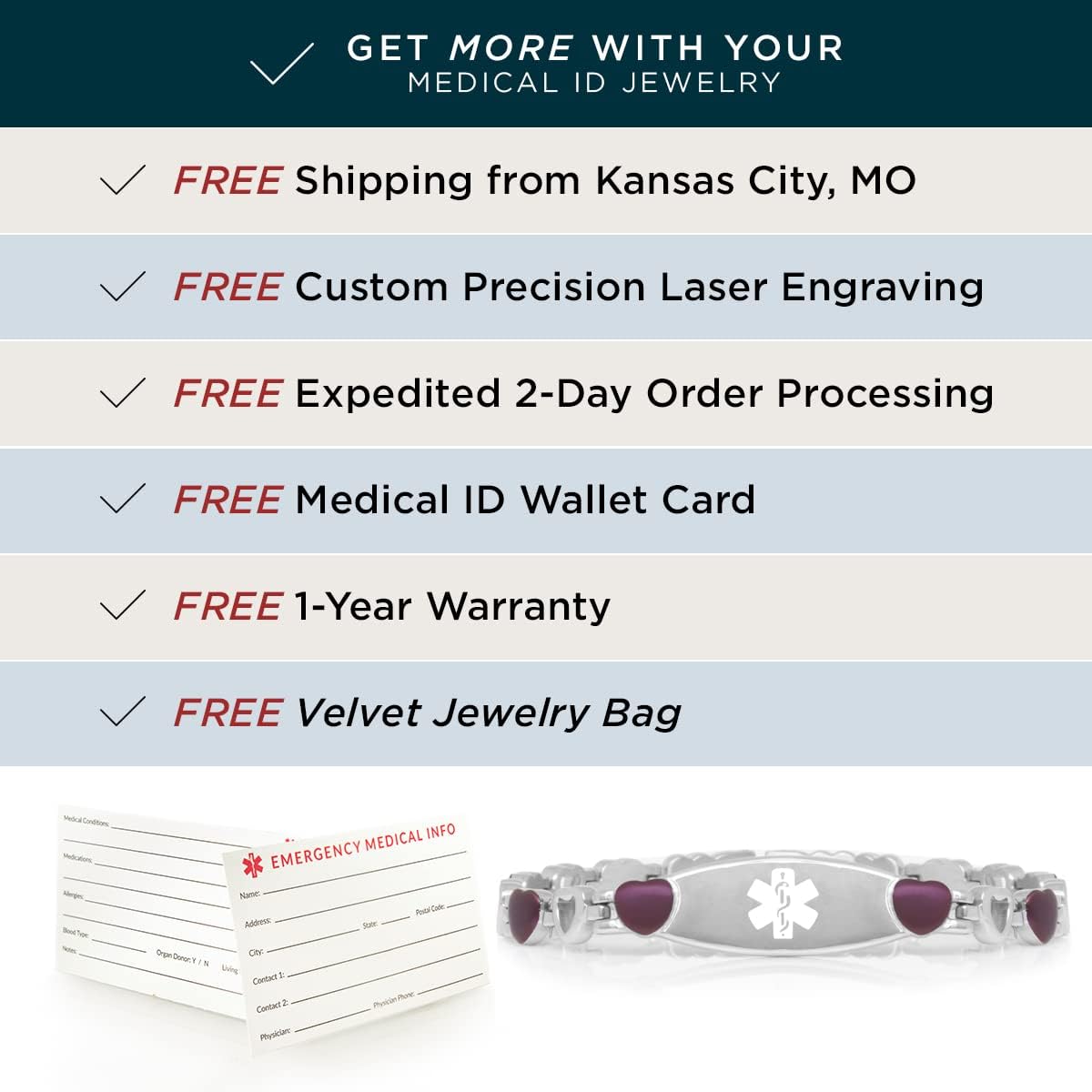Your new stainless steel purple heart link medical alert bracelet is crafted with you in mind. This durable and reliable medical ID bracelet is made from a nickel-free stainless steel that is tough enough to withstand daily wear and tear. A perfect 24/7 safety solution, this alert bracelet is also waterproof and hypoallergenic. This medical alert bracelet features a medical caduceus symbol at the center of the ID tag that is internationally recognized by first responders and medical personnel. This symbol alerts medical professionals to look for your medical information that is custom engraved with our precision laser engraving technology into your medical alert ID tag. Your medical information assists EMTs and medical professionals in providing prompt and accurate treatment when in an emergency. This medical alert bracelet features precise and clear, chemical free, permanent laser engraving that is included with your purchase. Your new medical alert bracelet is covered by our free one year warranty. We are happy to assist you with any questions you may have. Our Kansas City based customer care team is ready and available to assist you.