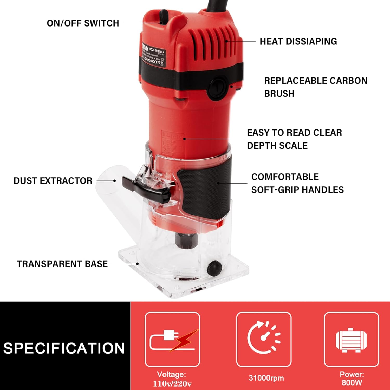 ?【Product Description】This 800-watt handheld woodworking router features a powerful pure copper motor with variable speed control (up to 31,000 RPM) to provide stable performance for trimming, grooving, edge shaping, and pattern cutting. Soft start and constant electronic feedback ensure smooth operation. The transparent adjustable base enhances visibility and depth control.?【Product Information】Product size: 8.6 x 7.9 x 5.5 inchesNet weight: 1.7 kg/3.75 lbsMotor power: 800 watts, pure copperNo-load speed: 10,000-31,000 RPM (variable speed)Base: transparent adjustable baseMaterial: aluminum alloy body + ABS shellChuck size: 6/6.35cm--2.36/2.5 inchesPackage includes:1x engraving machine host1 adapter cable (2 meters/6.56ft long)15 1/4 inch milling cutter sets1x curved edge guide2 wrenches, 2 carbon brushes1 straight guide, 1 dust cover2 chucks, 1 lever1 instruction manual